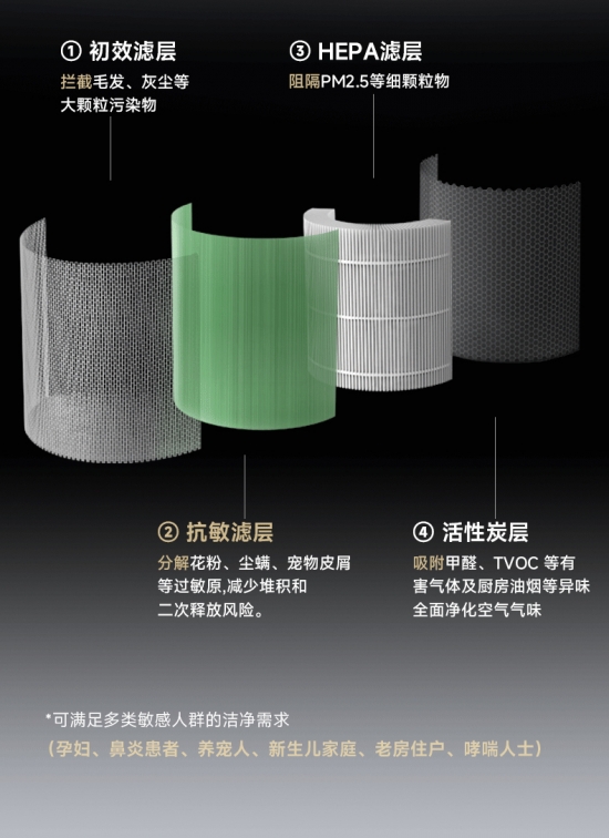 这套层层设防又环环相扣的滤网系统,实现了从"物理拦截"到"化学分解"的全流程净化,让每一次呼吸都安心无忧。